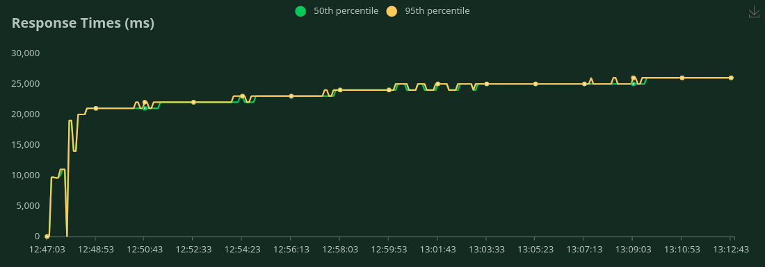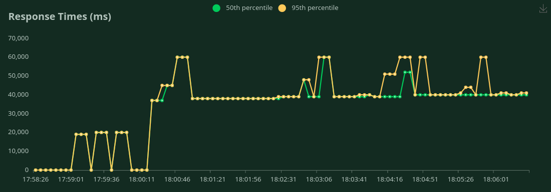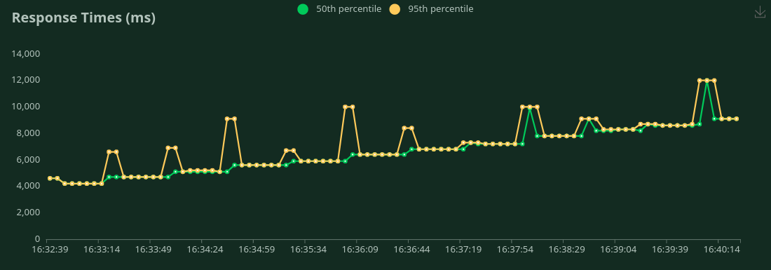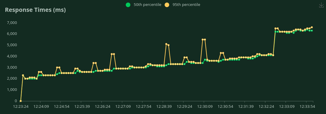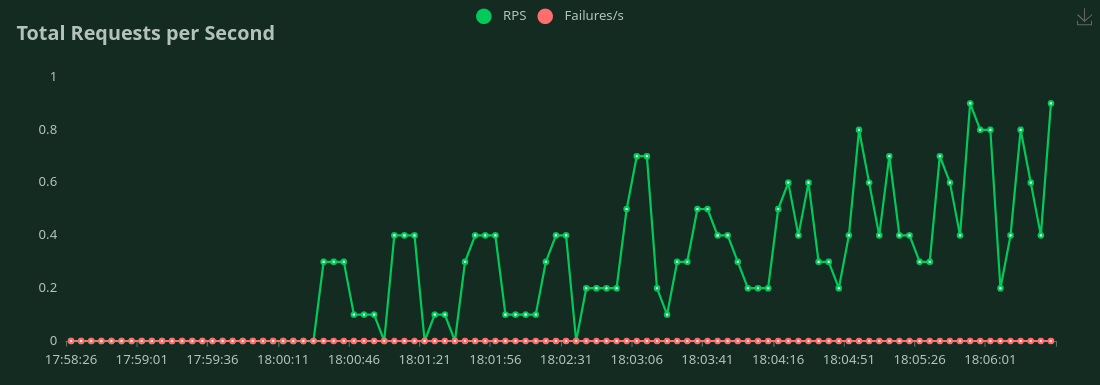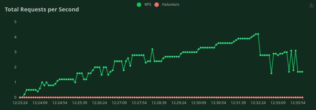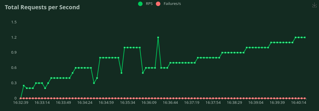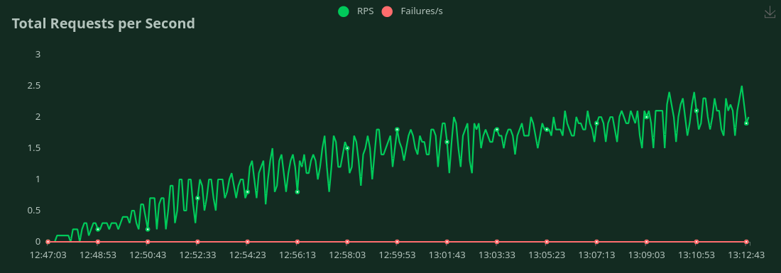 In each benchmarking test for a deployment config, we started from 1 user and kept increasing the Number of Users gradually till we saw a steady increase in the RPS. During the test, we also plotted the response times (in ms) and total requests per second.