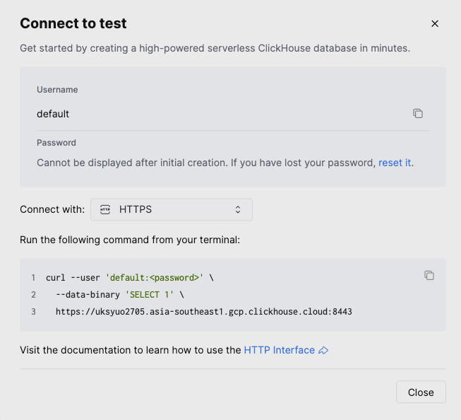 To get clickhouse credentials, create an account on clickhouse, sign in and create a service. After clicking the service you will see a connect button on the middle of left sidebar, which you can click to see the credentials as shown below. You can either create a database by uploading your files or use a predefined one.