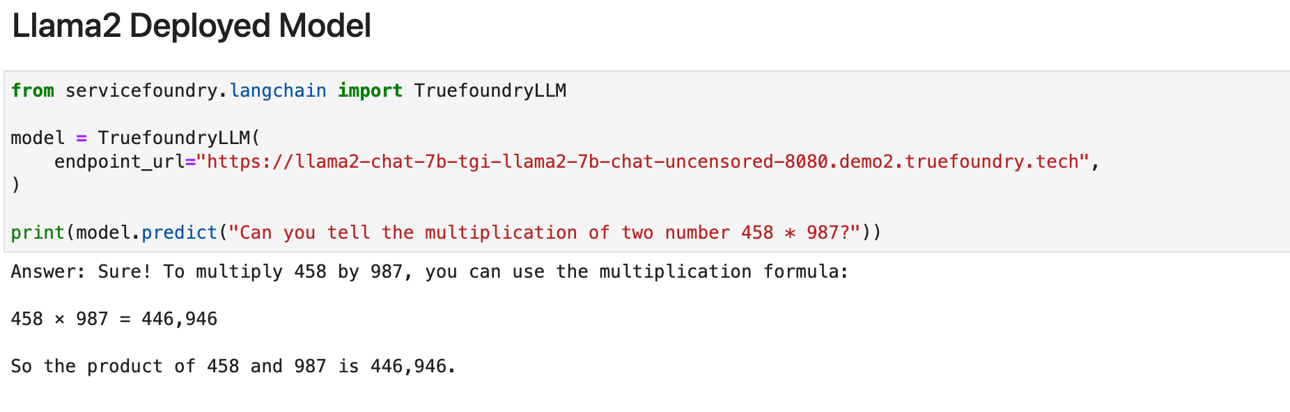 At first we will look at Meta's recently released model Llama-2-7B. We deployed Lllama-2 on TrueFoundry and tried it out with TrueFoundry's Langchain integrations. Here is the result for the same.