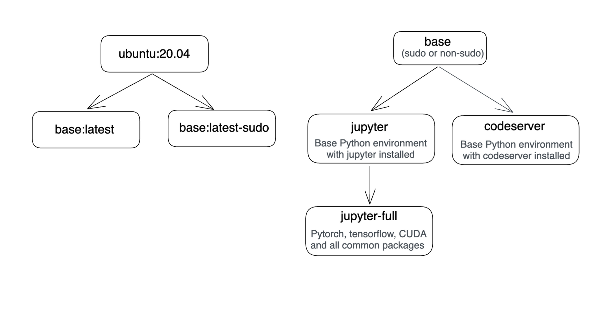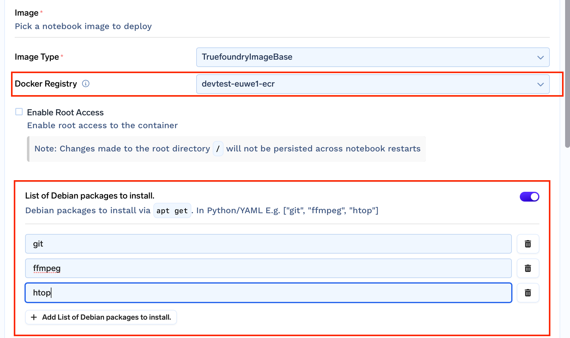 In many cases, the user needs root access to install some packages and try out a few things quickly. For this, we created two images for each type of image.truefoundrycloud/jupyter:latestandtruefoundrycloud/jupyter:latest-sudo. Where the images with sudo provide n0-password sudo access to the user.