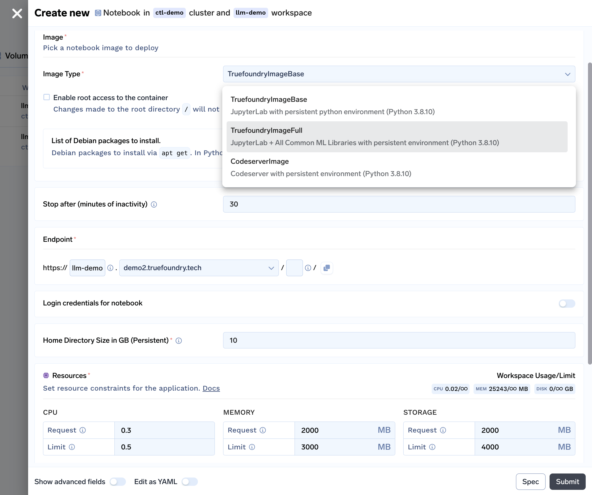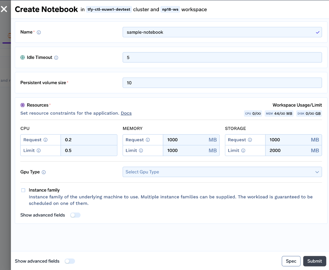 With all the features bundled into our notebook solution, here is what our notebook deployment form looks like: