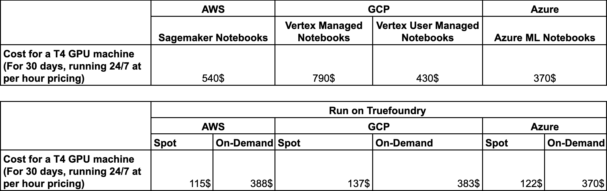 Since Truefoundry works by deploying on the customer's cloud by connecting their Kubernetes Cluster, here is the pricing for Truefoundry running on different cloud providers.
