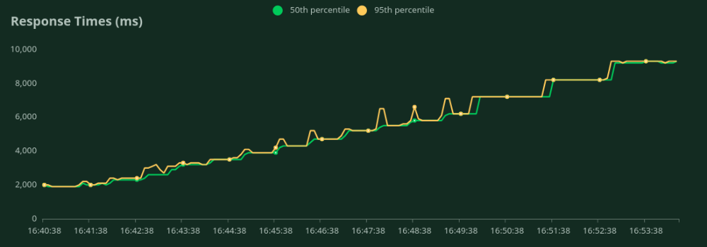 In each benchmarking test for a deployment config, we started from 1 user and kept increasing the Number of Users gradually till we saw a steady increase in the RPS. During the test, we also plotted the response times (in ms) and total requests per second.