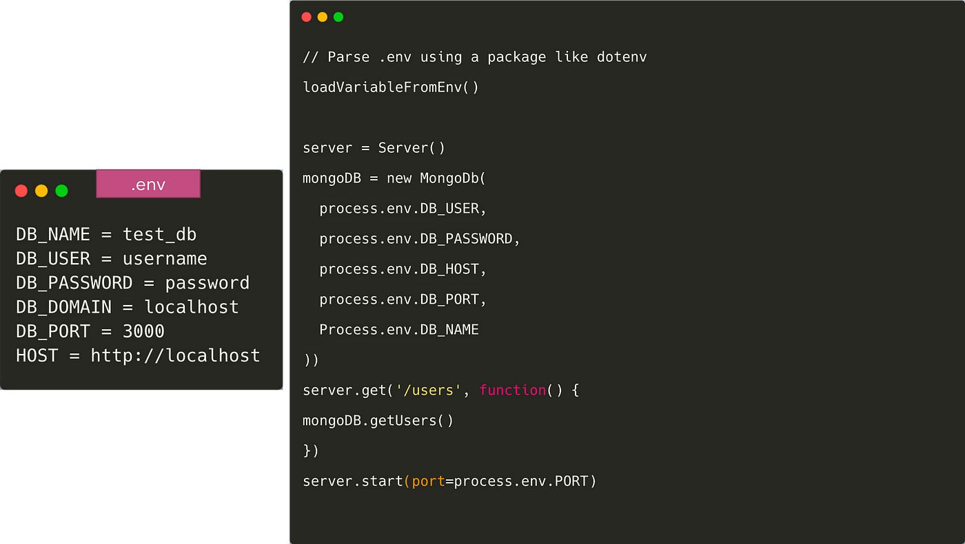 Once we do this, we need to load the variables in code from the .env file. There are several packages to do like dotenv and dotenv-expand. The .env file is not pushed to Git in this case and every developer overwrites the variable according to their own environment. To give all developers an idea of what environment variables need to be added, we usually commit a file like .env.example to Git.