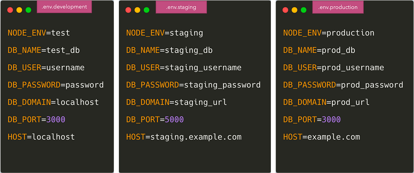 We will also need to provide values of these variables in the staging and production environments. Almost all deployment systems provide a way to store and provide environment variables like ConfigMap and Secrets in Kubernetes, or S3 for Elastic Container Service.