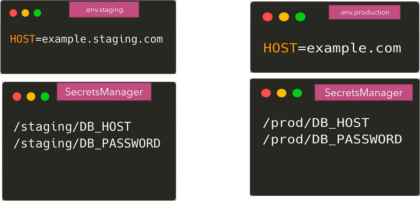 - Use external storage: This approach relies on storing the environment variables for staging, production , etc in a different storage layer like S3 or AWS Parameter Store. Only the production, staging environments have the permissions to read these values and hence it can be safeguarded from developers. SecretManagers also come in here that can store the secrets encrypted, provide access control and can also automatically rotate the secrets. A few examples of such secret managers / parameter stores are: