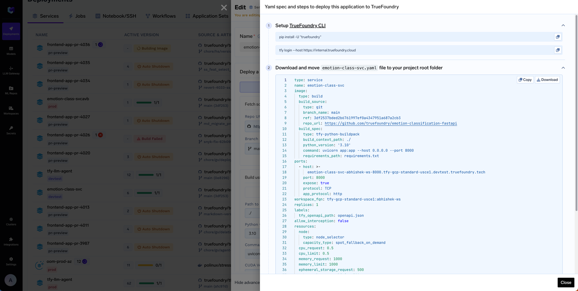 Truefoundry provides a yaml spec for every deployment made on the platform. This is auto-generated based on the configuration done by the developer / datascientist on the platform - so no-one needs to learn to write YAML spec. There is a yaml spec for cluster, workspace, deployment and even the integrations configuration in truefoundry.