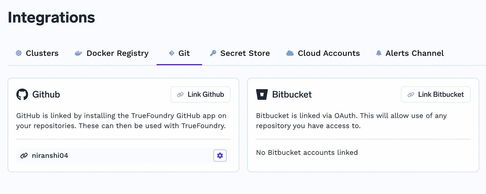 We can now deploy directly to Truefoundry from any Github or bitbucket repositories. Users can integrate with their own private repositories using the Oauth Flow and select the appropriate parameters to deploy the application.