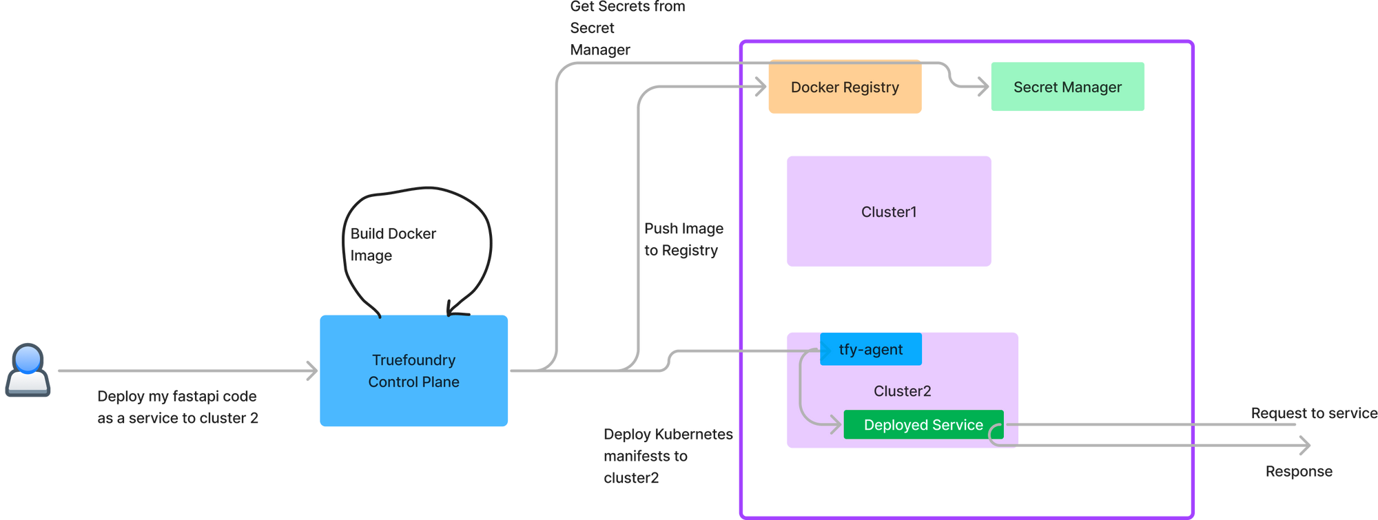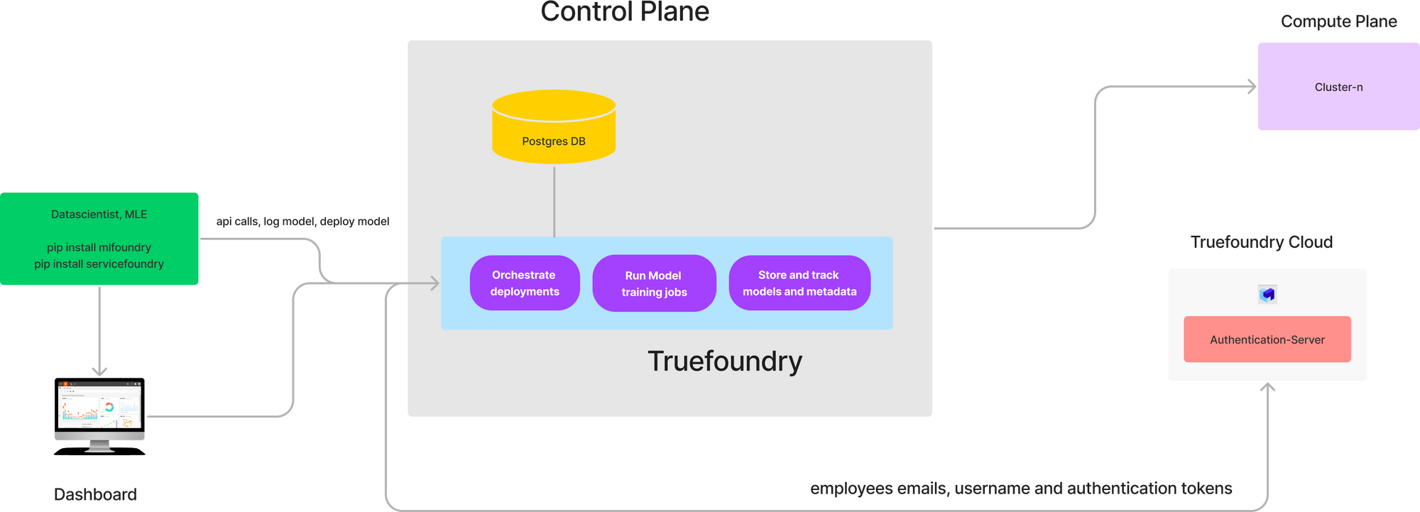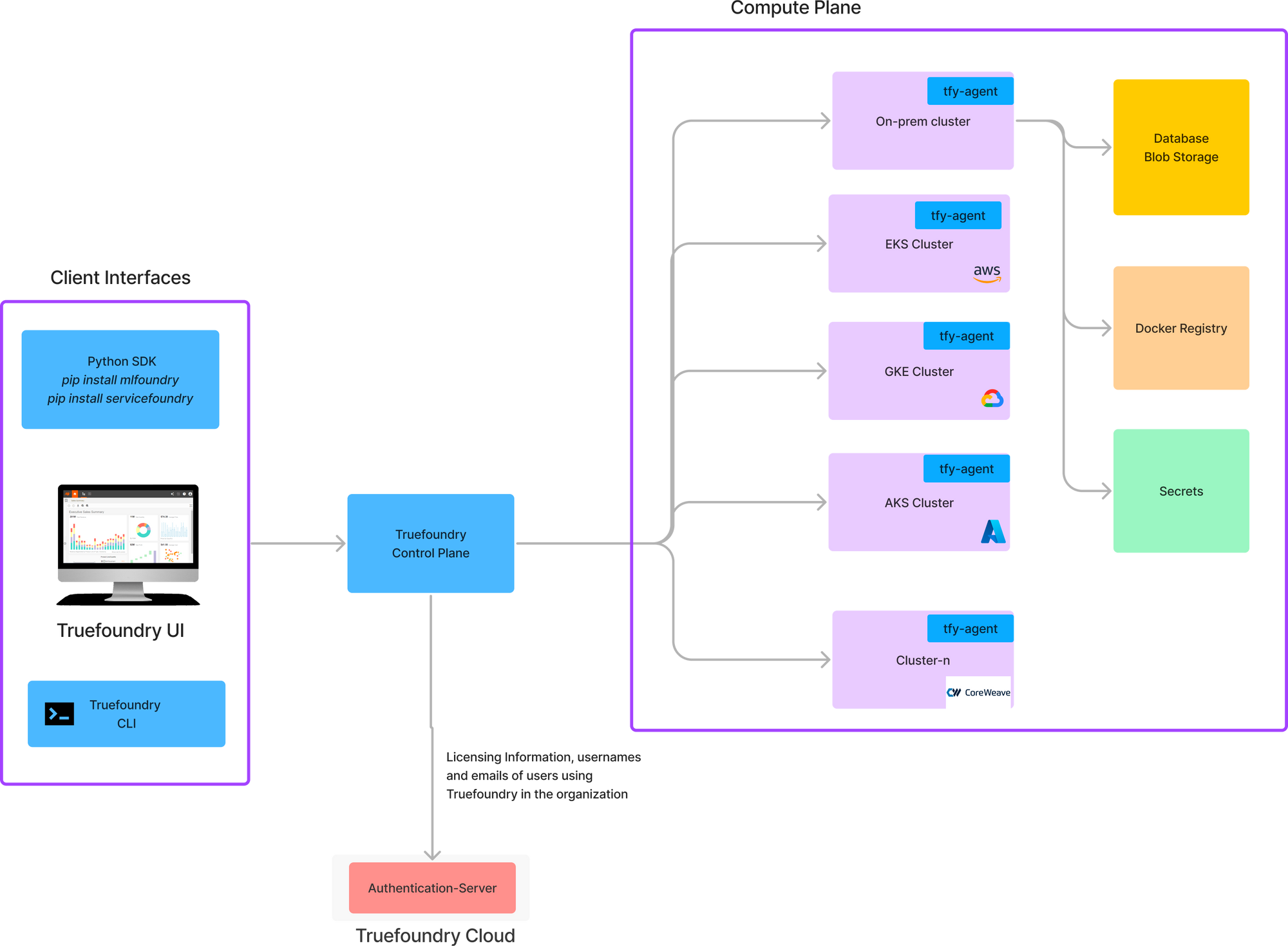 - Control Plane: This is the brain of the TrueFoundry system which does the orchestration of deployments across the different compute plane. We provide a hosted control plane in our usual plan. For enterprise customers, the control plane can also be deployed on the customers' cloud.