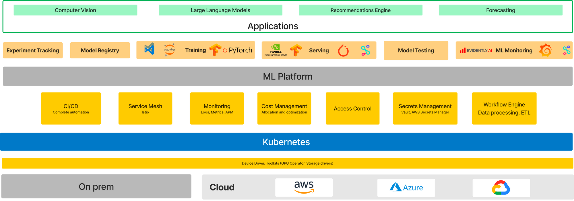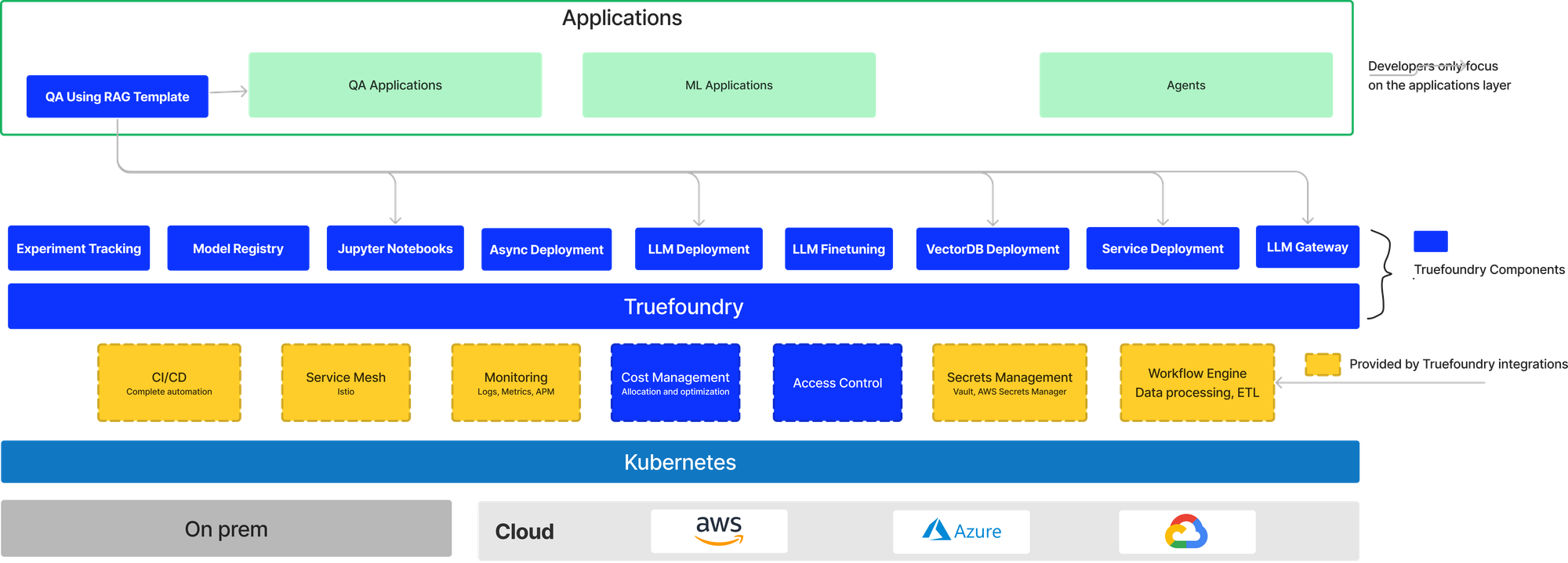 Ideally, developers should be spending more in the top green layer while the lower layers should be completely abstracted away from them. TrueFoundry provides a open and customizable stack that works with what you are currently using and helps datascientists iterate on the applications without focusing on the underlying infrastucture layers.