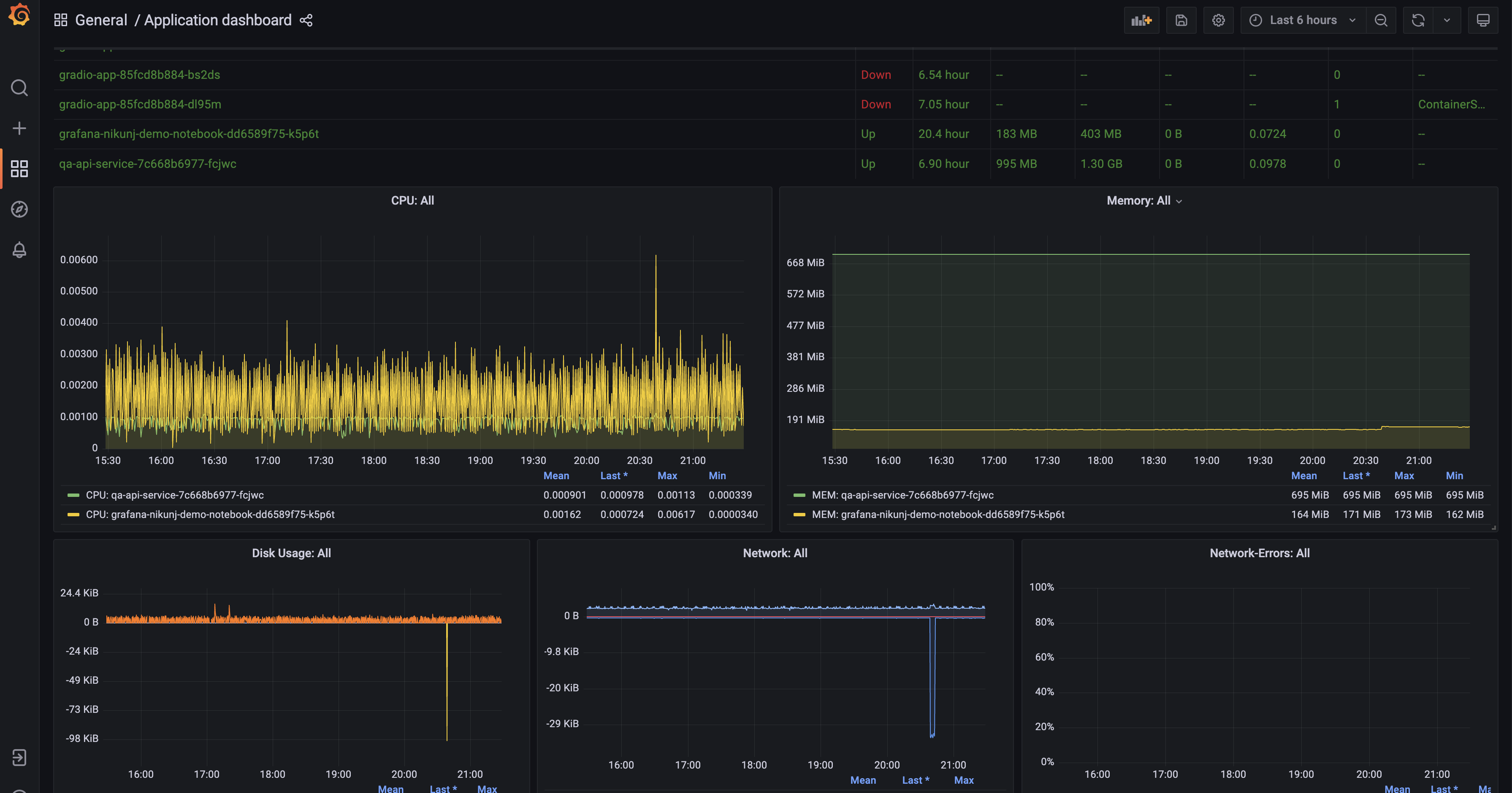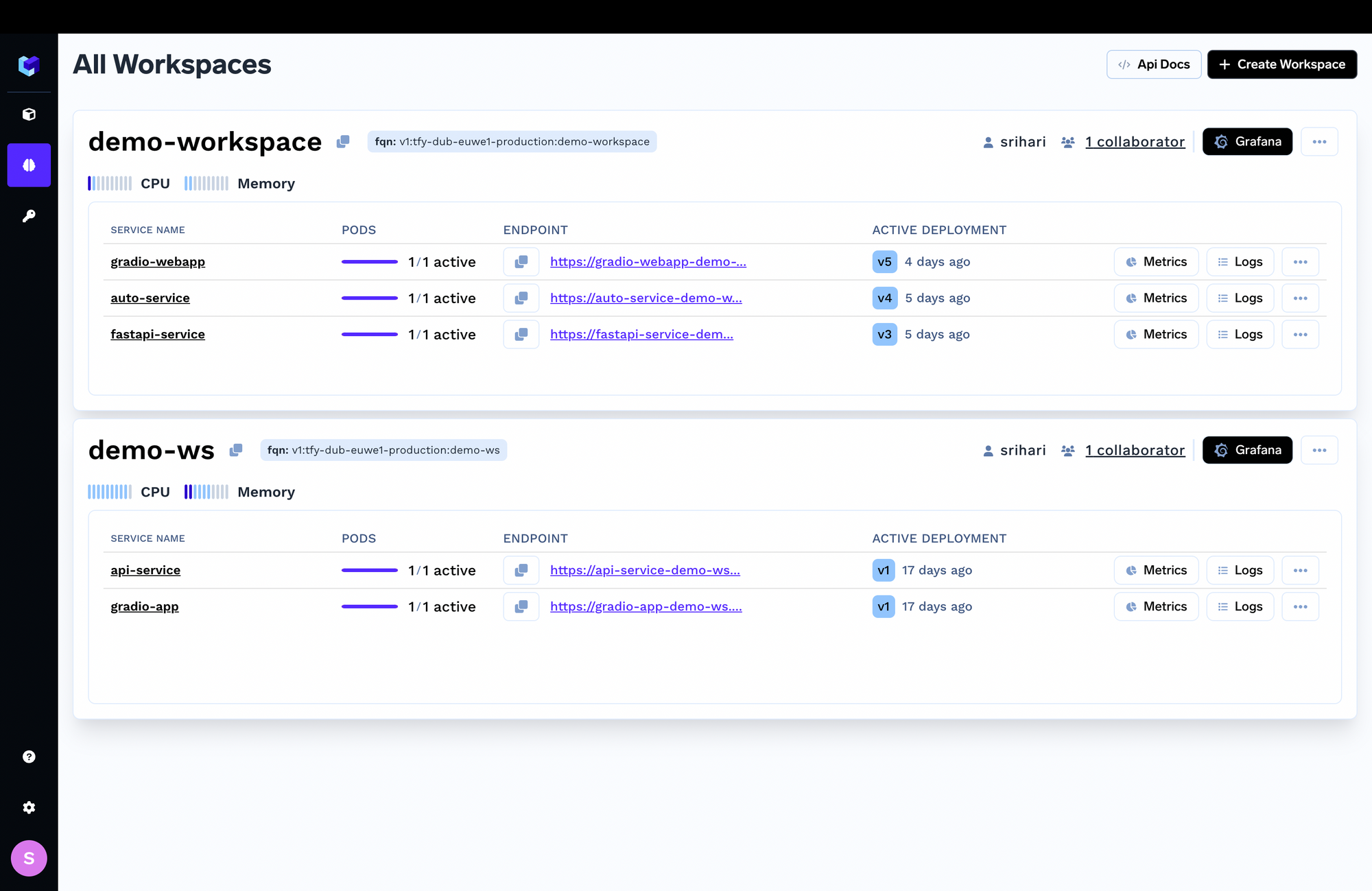 The TrueFoundry dashboard also links to metrics and logs that come out-of-the-box with TrueFoundry deployments in the form of Grafana dashboards. You can read more about them here.