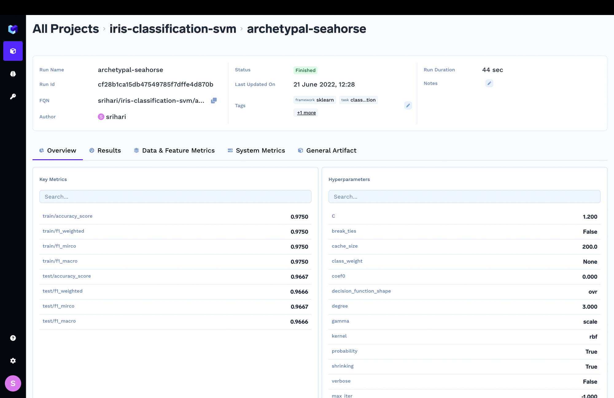 run.log_params(clf.get_params())Next, we train the model on our train dataset. Once the training is complete, we compute the various metrics and log them to MLFoundry using log_metrics.
