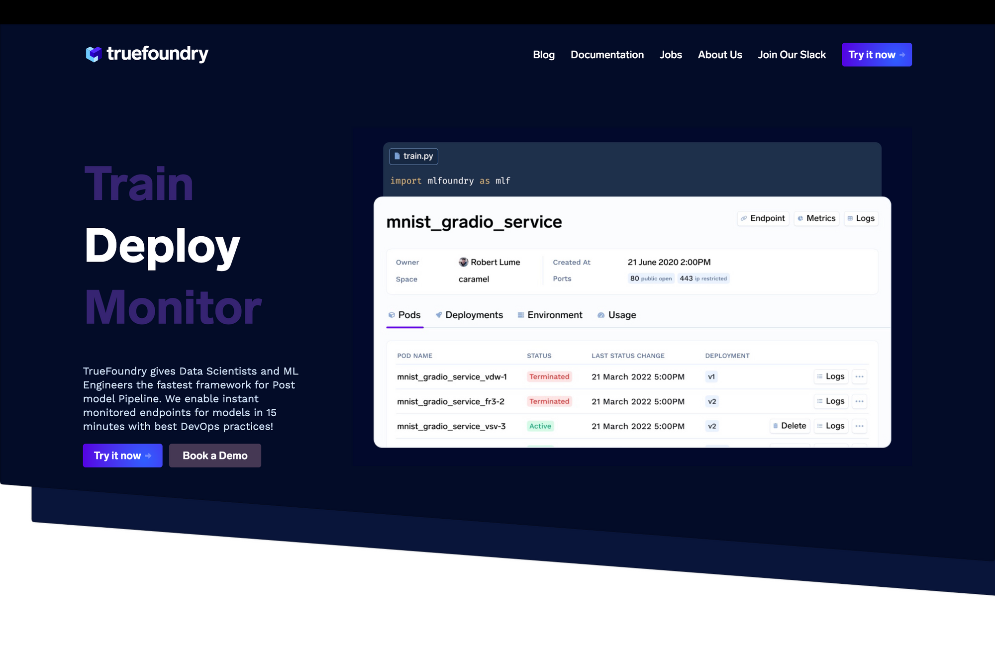 If you are training machine learning models to solve a problem, TrueFoundry helps you track different experiments and makes it easy and intuitive to deploy models with best practices and make it available for public use in a matter of minutes.