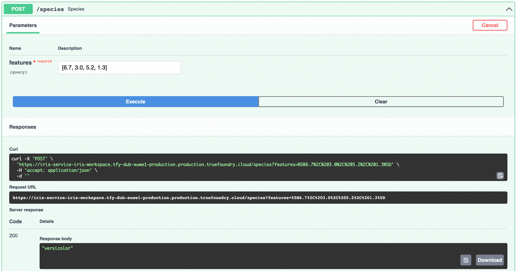 Inside that Python file, we will fetch the model we just trained and saved using the run id, using mlfoundry. Note that API key required by mlfoundry will be available as the environment variable TFY_API_KEY.